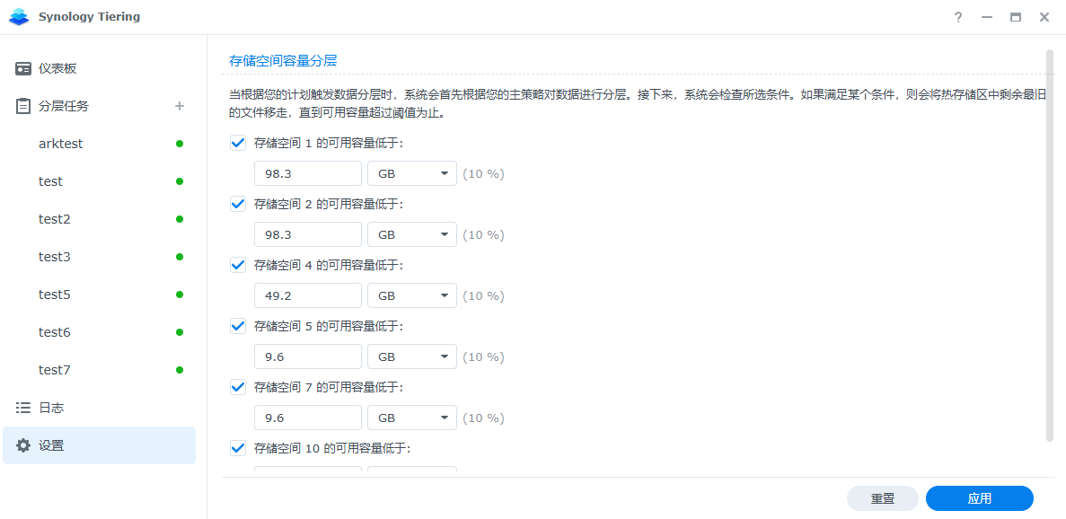 在Synology Tiering的设置中配置存储空间自动分层规则。如果存储空间可用容量低于设置容量,会将更多文件分层到冷层共享文件夹: