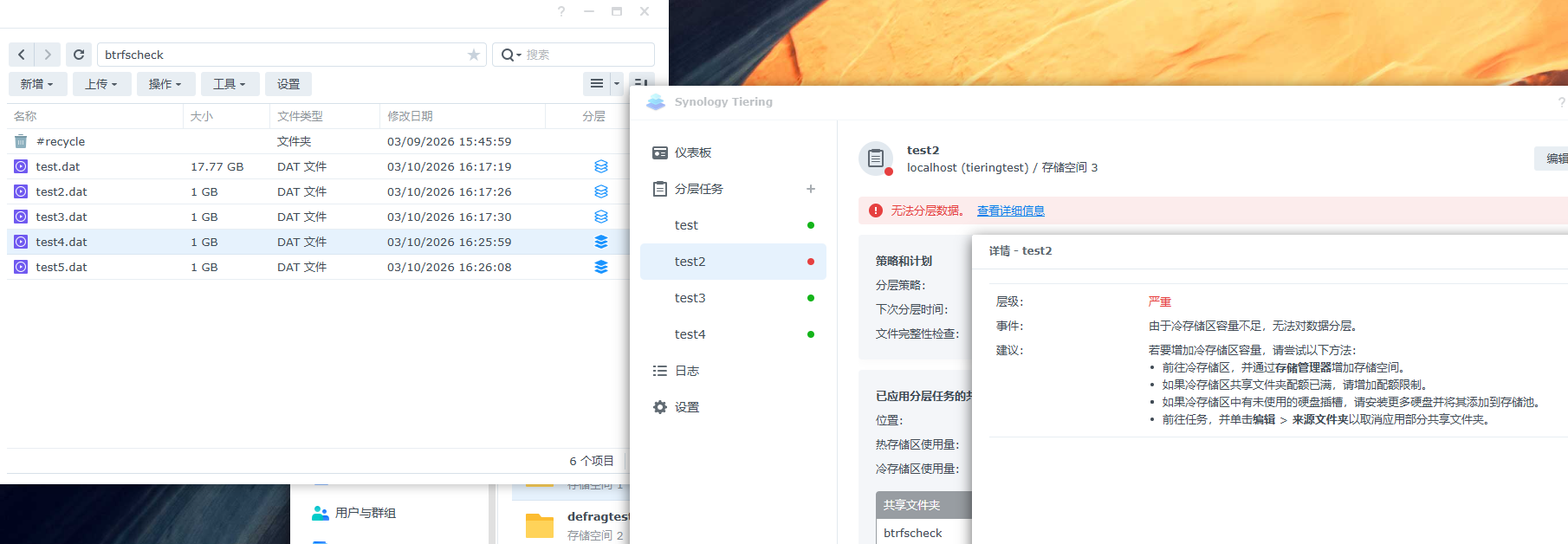 如果冷数据共享文件夹达到配额将会提示无法分层。