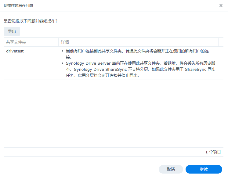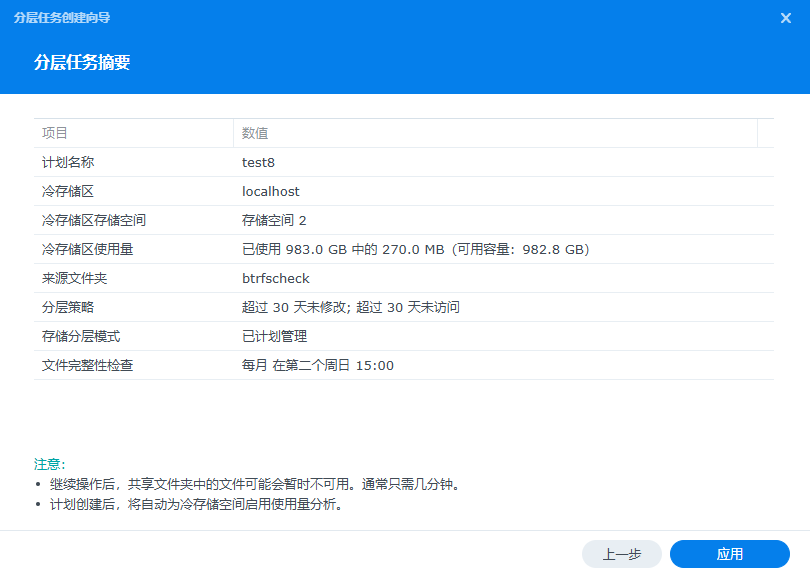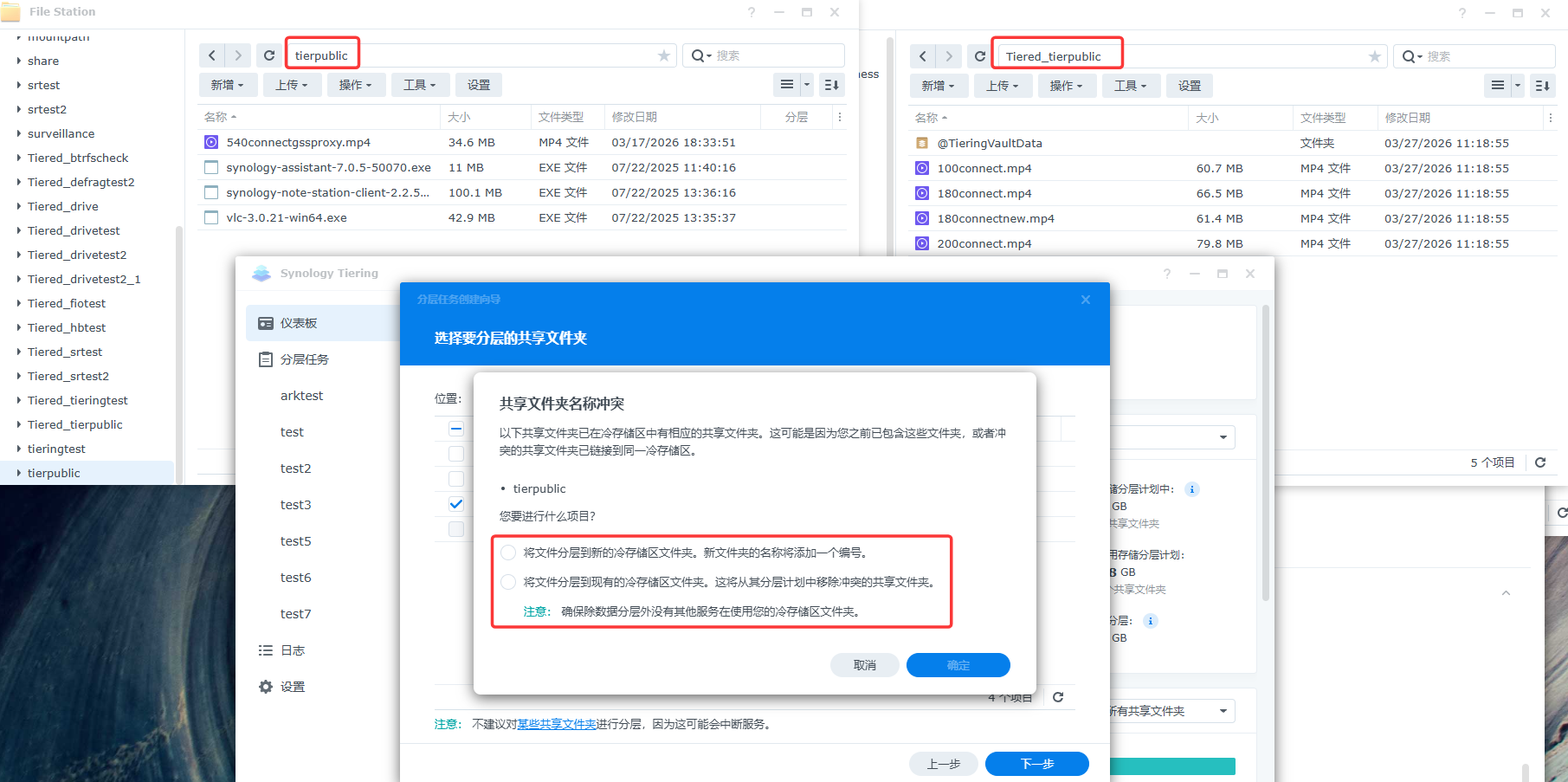 如果冷层存储空间有之前取消分层的共享文件夹,重新建立任务时会有以下提示: