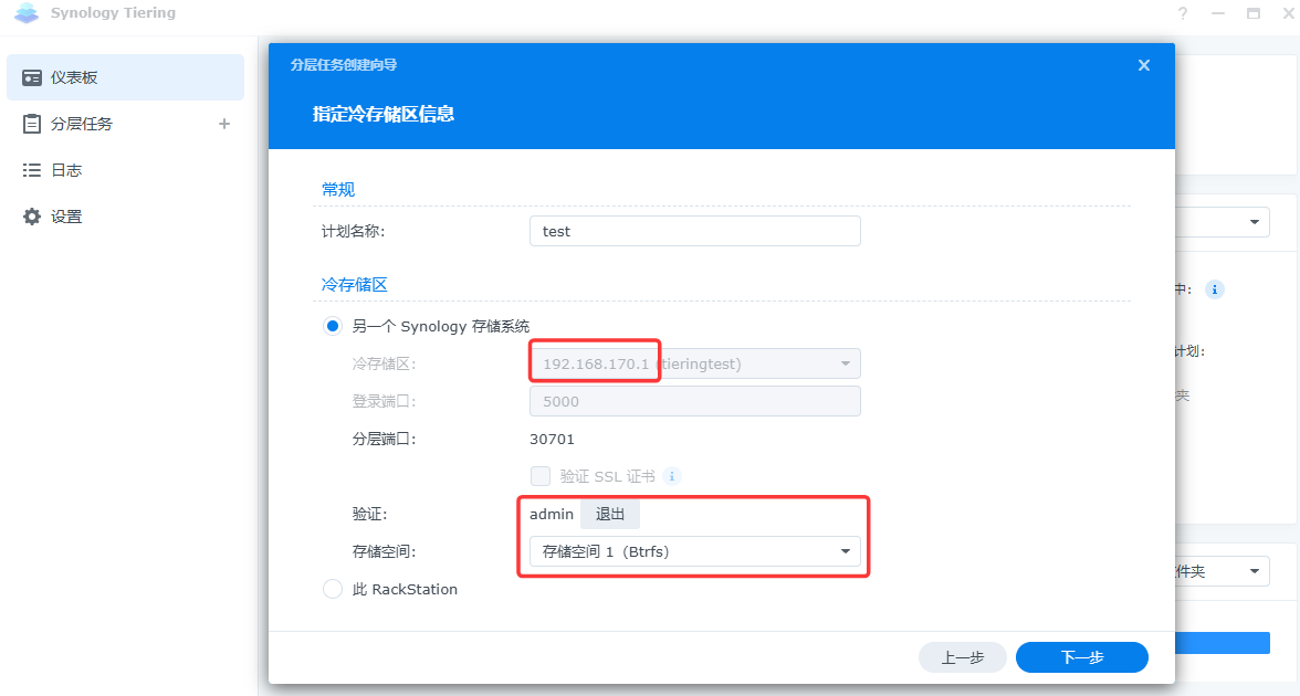 在Synology Tiering中选择创建分层任务,可以选择另一个Synology存储系统或者此Rackstation。