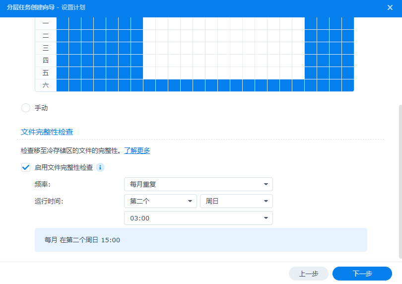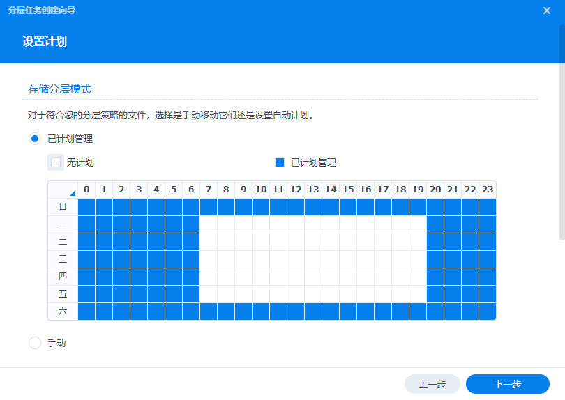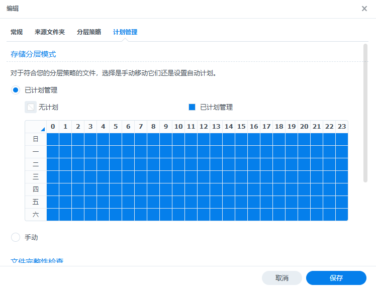 计划管理,如果选择已计划管理,则会在配置计划时间的每小时整点执行分层。如果选择手动将需要用户手动运行存储分层: