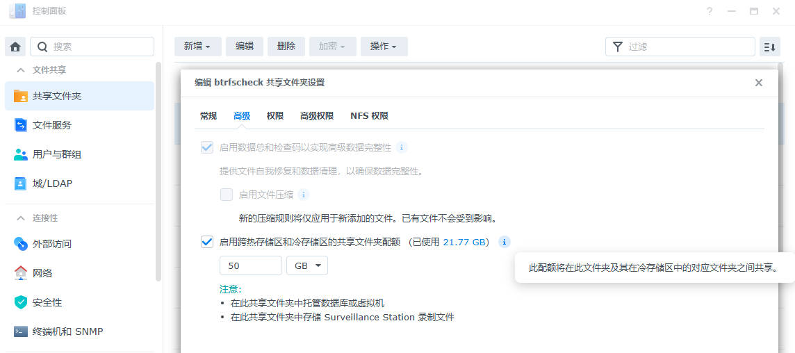 冷存储共享文件夹的空间配额容量仅计算冷存储区。